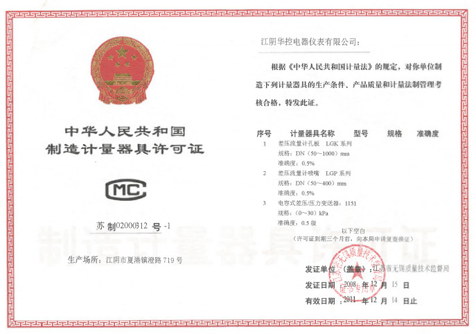 江陰華控電器儀表有限公司主要從事節(jié)流裝置,標(biāo)準(zhǔn)孔板,文丘里管,標(biāo)準(zhǔn)噴嘴的生產(chǎn)銷(xiāo)售。公司擁有近20多年的生產(chǎn)制造經(jīng)驗(yàn),并承接工程配套任務(wù),同時(shí)還遠(yuǎn)銷(xiāo)亞、非等。按ISO9001準(zhǔn)體系運(yùn)行,實(shí)行質(zhì)量管理。公司取得了特種設(shè)備生產(chǎn)許可證,產(chǎn)品符合中華人民共和國(guó)標(biāo)準(zhǔn)GB/T2624T以及國(guó)際標(biāo)準(zhǔn)IS0516的規(guī)定,符合市監(jiān)特涵〖2018〗515號(hào)文件和壓力管道元件TSG D7006-2020要求。